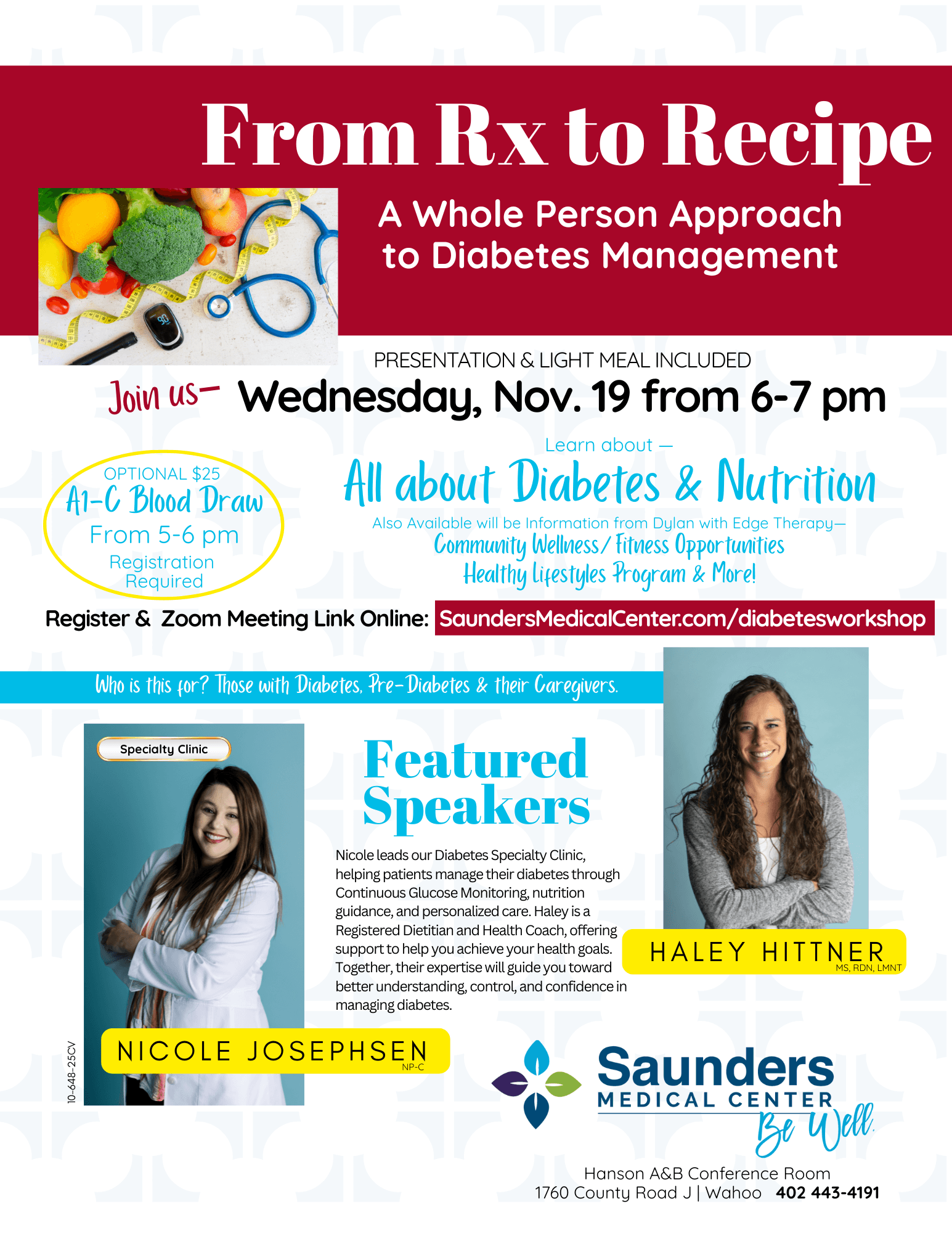 Join us for a light meal and presentation. Optional A1C discounted blood draw available prior to the presentations by Nicole and Haley: Nicole Josephsen who leads our Diabetes Specialty Clinic, helping patients manage their diabetes through Continuous Glucose Monitoring, nutrition guidance, and personalized care. Haley Hittner is a Registered Dietitian and Health Coach, offering support to help you achieve your health goals. Together, their expertise will guide you toward a better understanding, control, and confidence in managing diabetes.